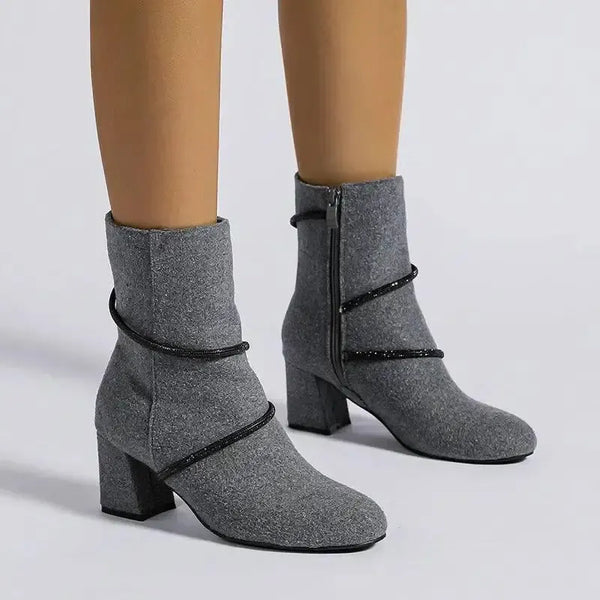 Chunky Mid Heel Boots With Rhinestone Chain Design Shoes For