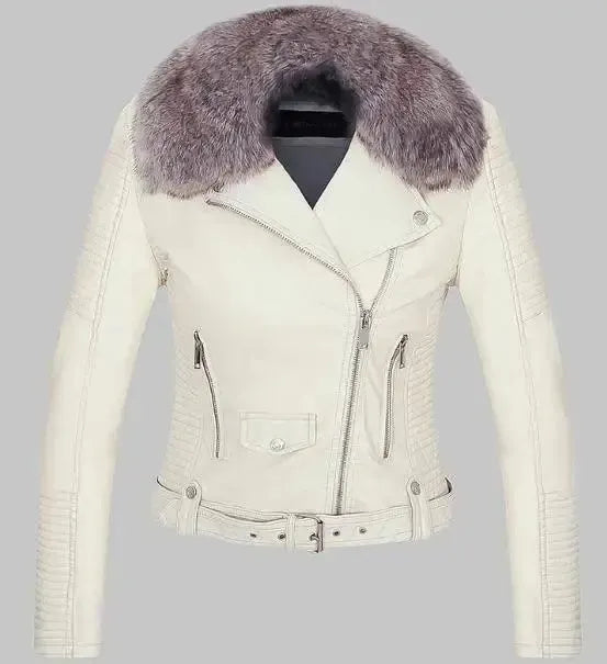 DETACHABLE FUR COLLAR WARM FAUX LEATHER JACKET