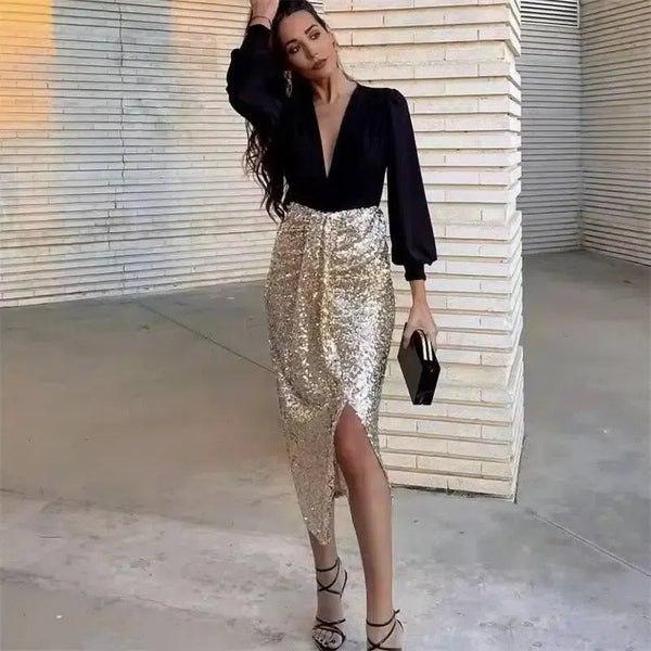 Shine bright with this European and American style pleated mid-length skirt, crafted from luxe polyester with shimmering sequins. Its high-waist design flatters your silhouette, while the light, breathable fabric ensures comfort all day or night.