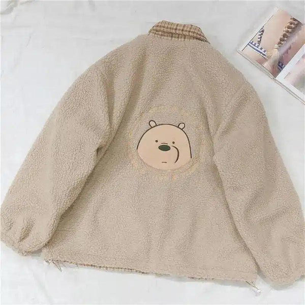 Bear embroidered lamb fur plaid coat