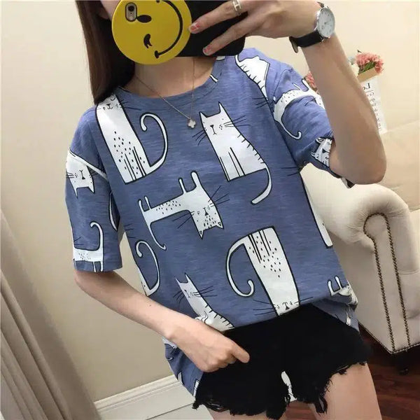 Cat Print Short Sleeve T-Shirt Red Student Base Top
