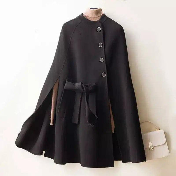 This stylish cape coat comes equipped with long sleeves, decorative front buttons, and practical side pockets, perfect for storing your essentials while looking fabulous.