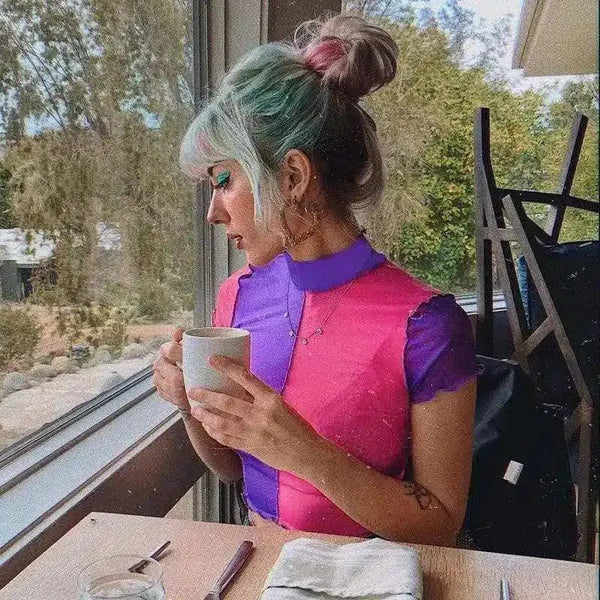 contrast mesh short-sleeved umbilical top