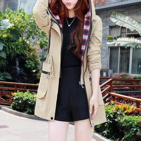 - Neckline/Shoulder Style: Full zip closure with a plaid-lined hood