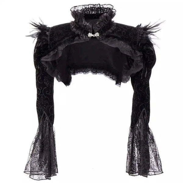 - Neckline or Shoulder Style: High lace collar with feather trim