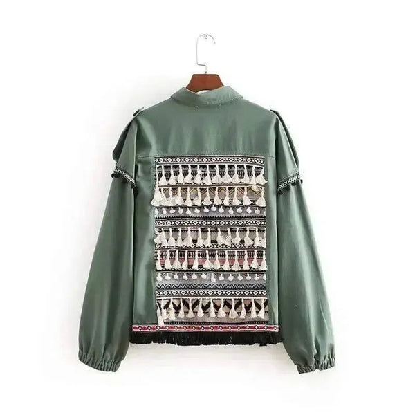 This epaulette jacket features a stand collar adorned with embellishments, adding a touch of elegance to your casual wardrobe. Its long sleeves with elastic cuffs provide comfort while maintaining a chic aesthetic.