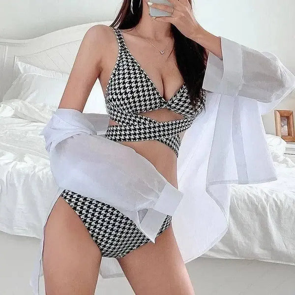 Product Description: Houndstooth Cross-Tie Swimsuit Bikini