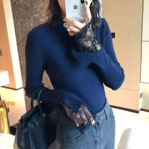Lace Cuff Ribbed Turtleneck Sweater