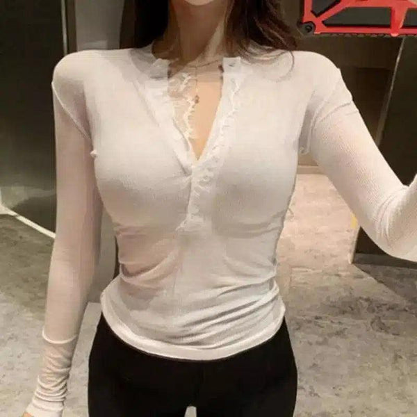 Women's Long Sleeve Sheer Lace Trim Top