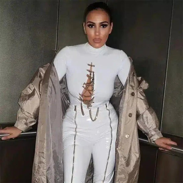 White Turtleneck Top with Chain Detail – Bold Fashion Look