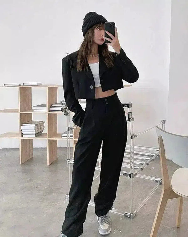 - Type of garment: Two-piece ensemble featuring a cropped blazer and high-waisted trousers
