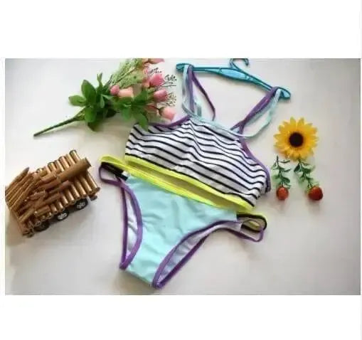Stripped High Neck Patchwork Bikini Set Swimsuit Bathing