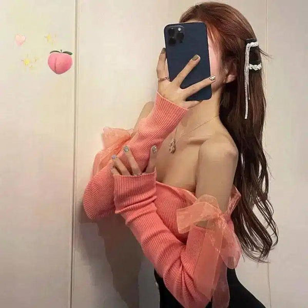 Women's Off-Shoulder Knit Sweater with Tulle Sleeves