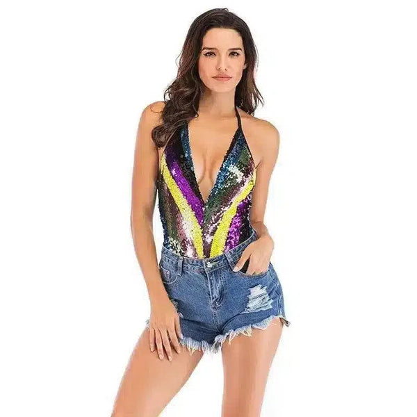 Sequin Halter Bodysuit & Ripped Denim Shorts
