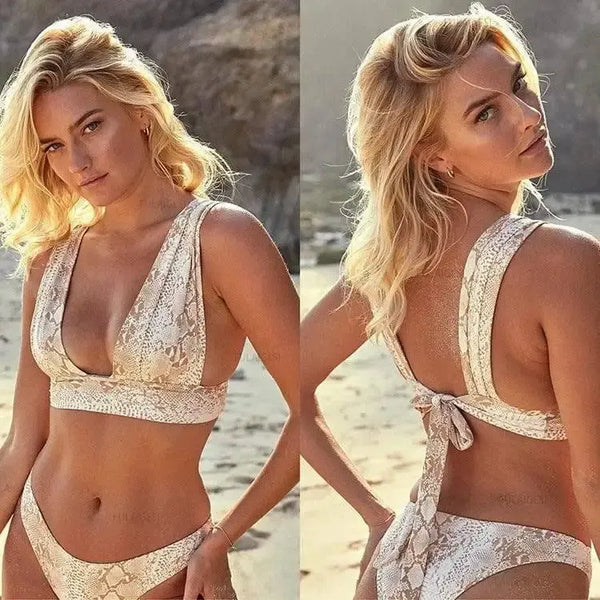 - Design: Snake print split bikini, featuring an eye-catching reptilian pattern