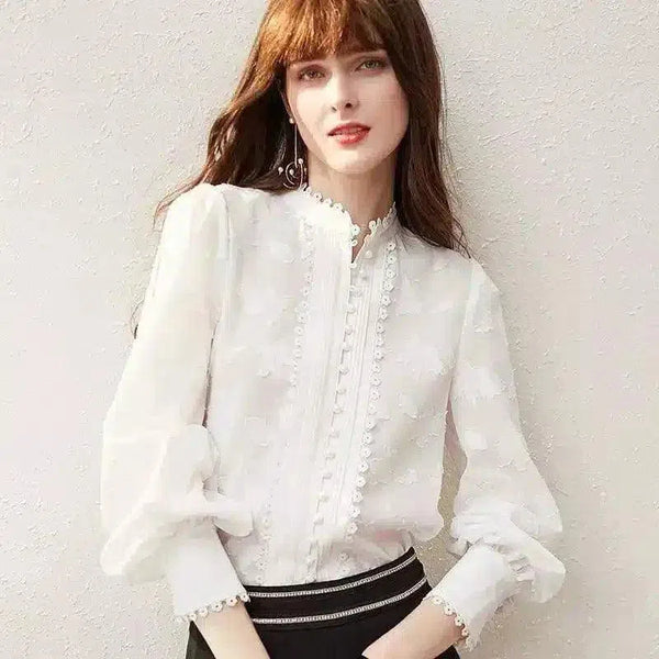 - Delicate Scalloped Edges - The sleeves and collar are finished with scalloped edges, contributing to the blouse's intricate and polished look.