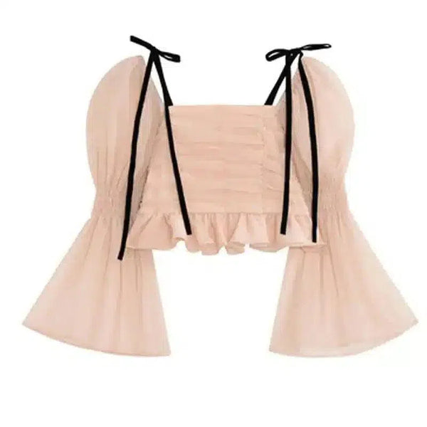 Tie-Strap Smocked Crop Top with Bell Sleeves