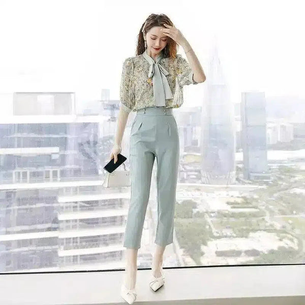 Womens Elegant Tie-Neck Blouse & Cropped Pants