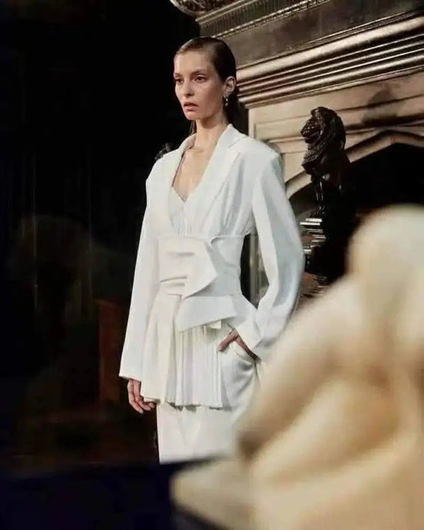 - Fit: Tailored fit with a cinched waist and flared silhouette