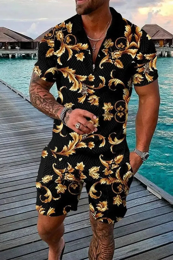 Men's Fashion Print Lapel Zipper Two-Piece Suit