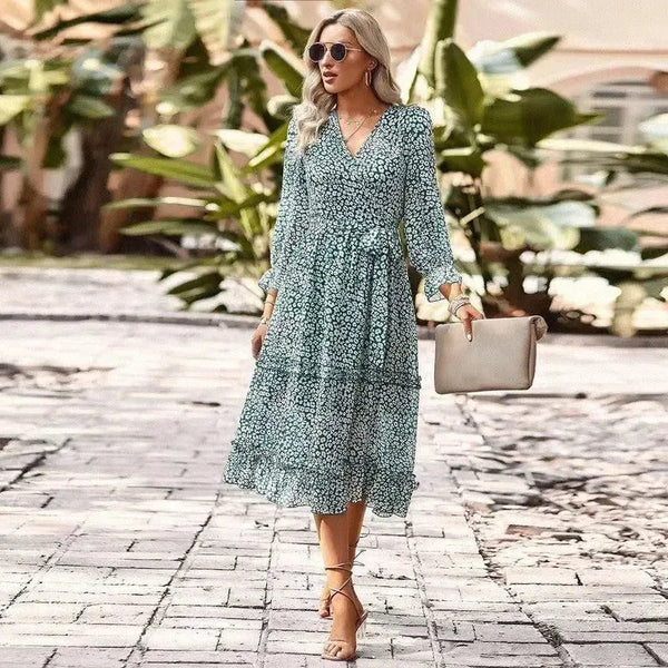 Temperament Elegant V-neck 34 Sleeve Tie-shoulder Floral