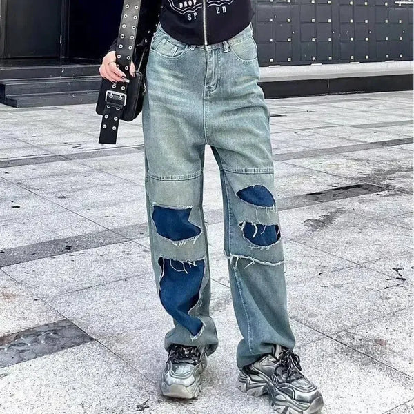 Women's Straight Pants Ripped Slimming Stitching Jeans